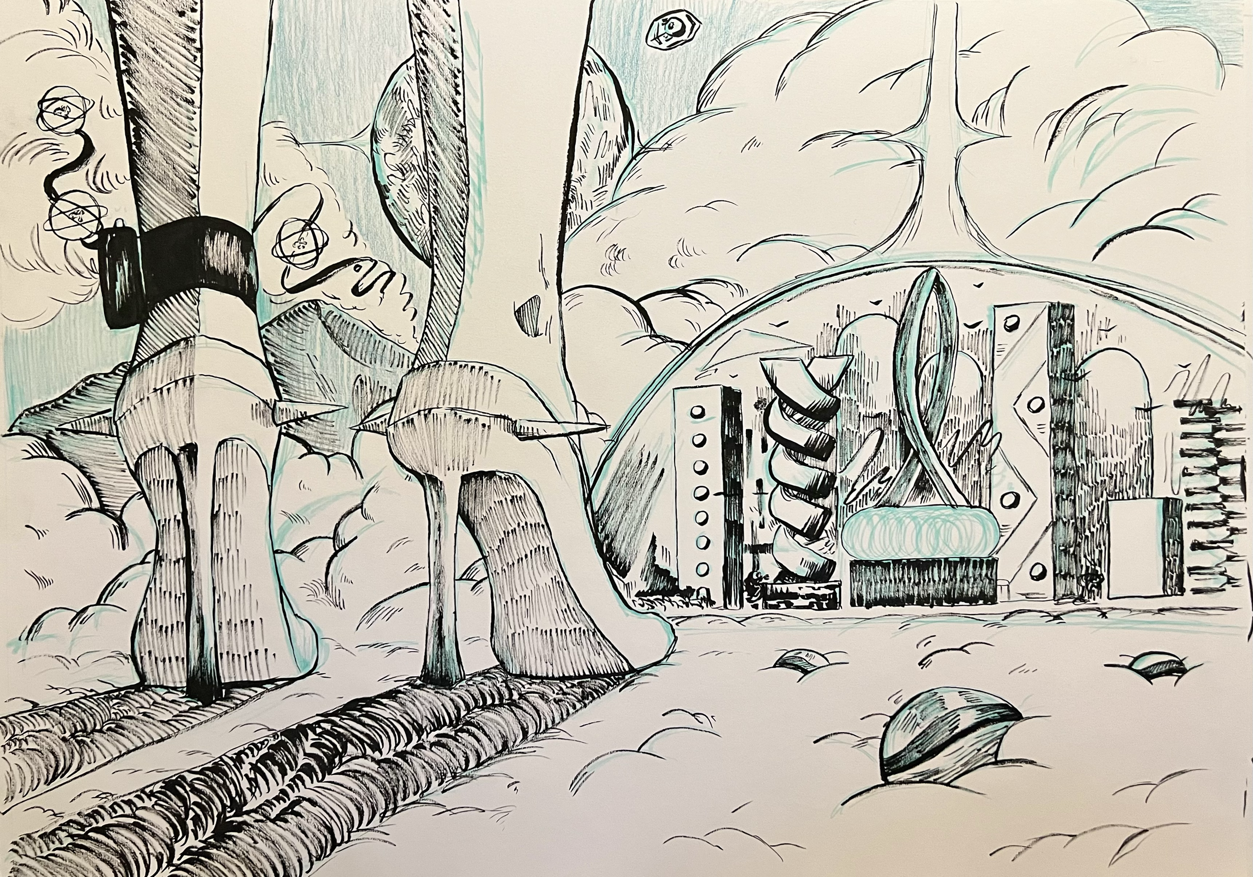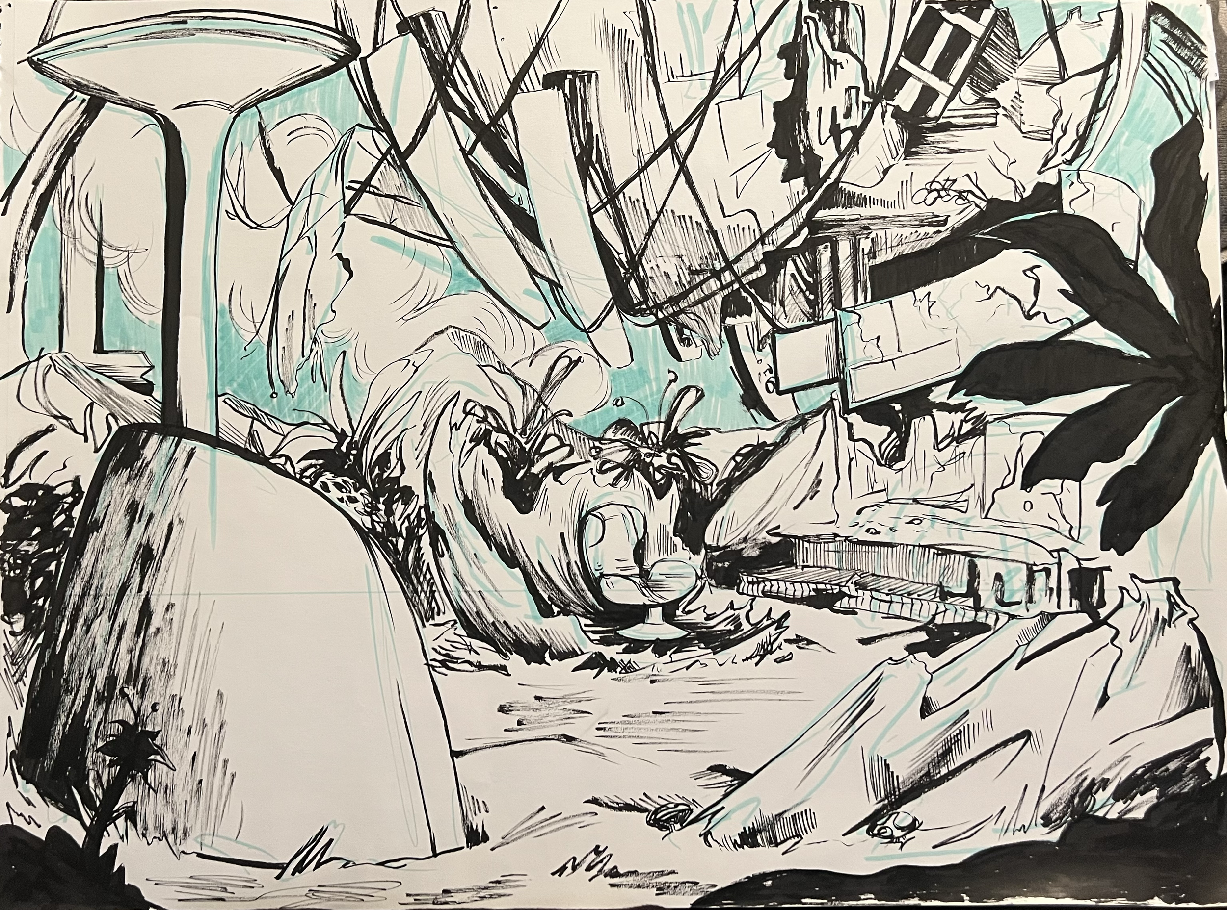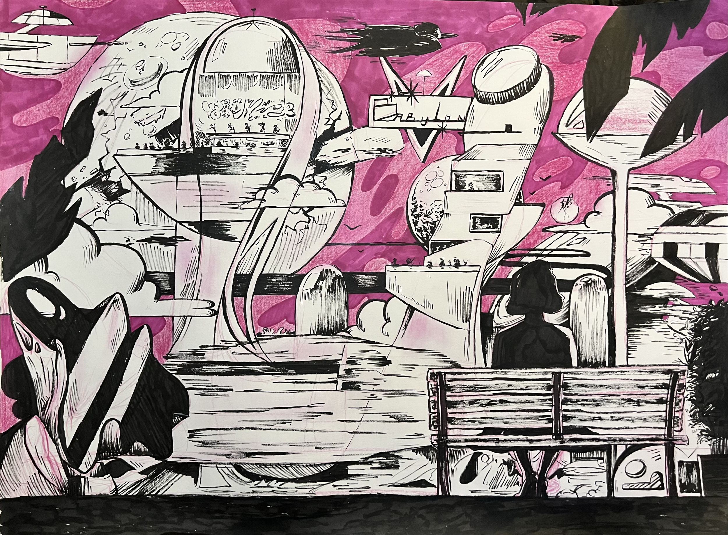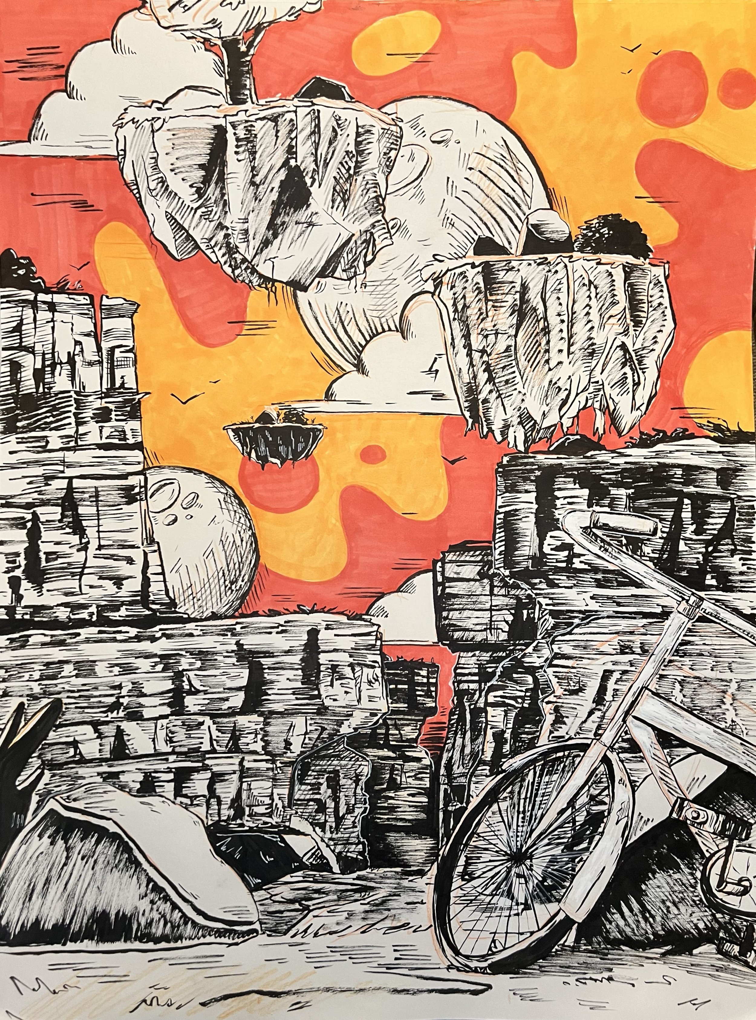“Fill Up & Move Forward”, 2024; Acrylic, Wood, Mesonite, Paper, 250 lbs of Sand, Metal Cars